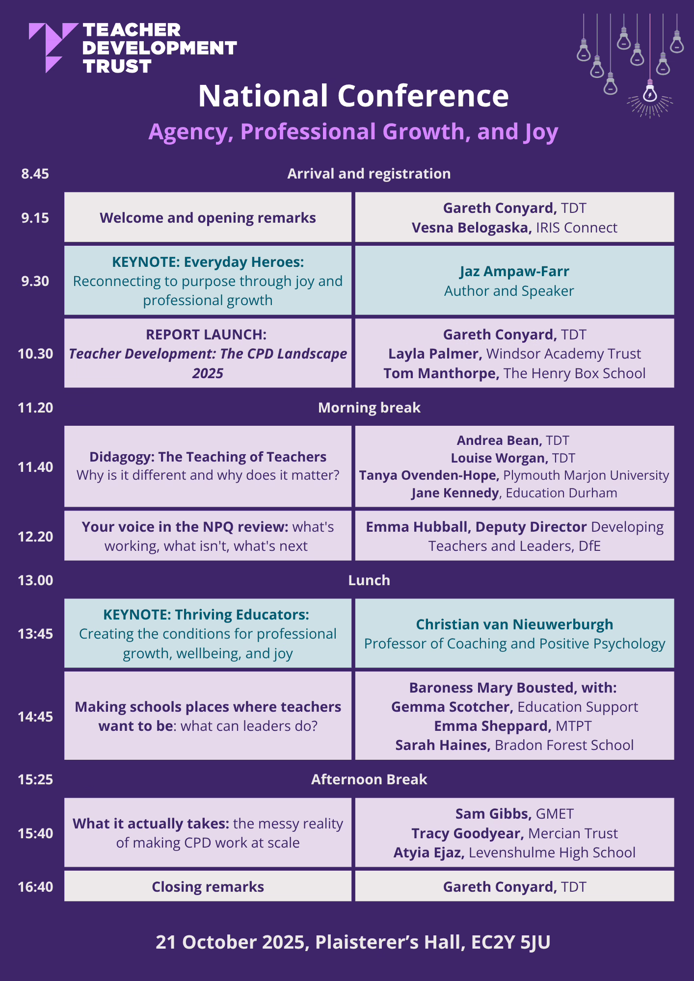 Sam Gibbs (GMET) and Tracey Goodyear (Mercian Trust) will dive into CPD that’s actually working in their trusts – from the big picture (culture and inclusion) to the nuts and bolts (timelines, Power BI dashboards, and quality assurance).